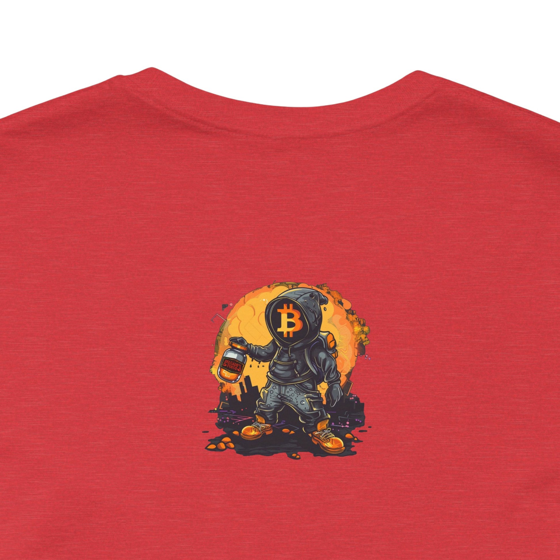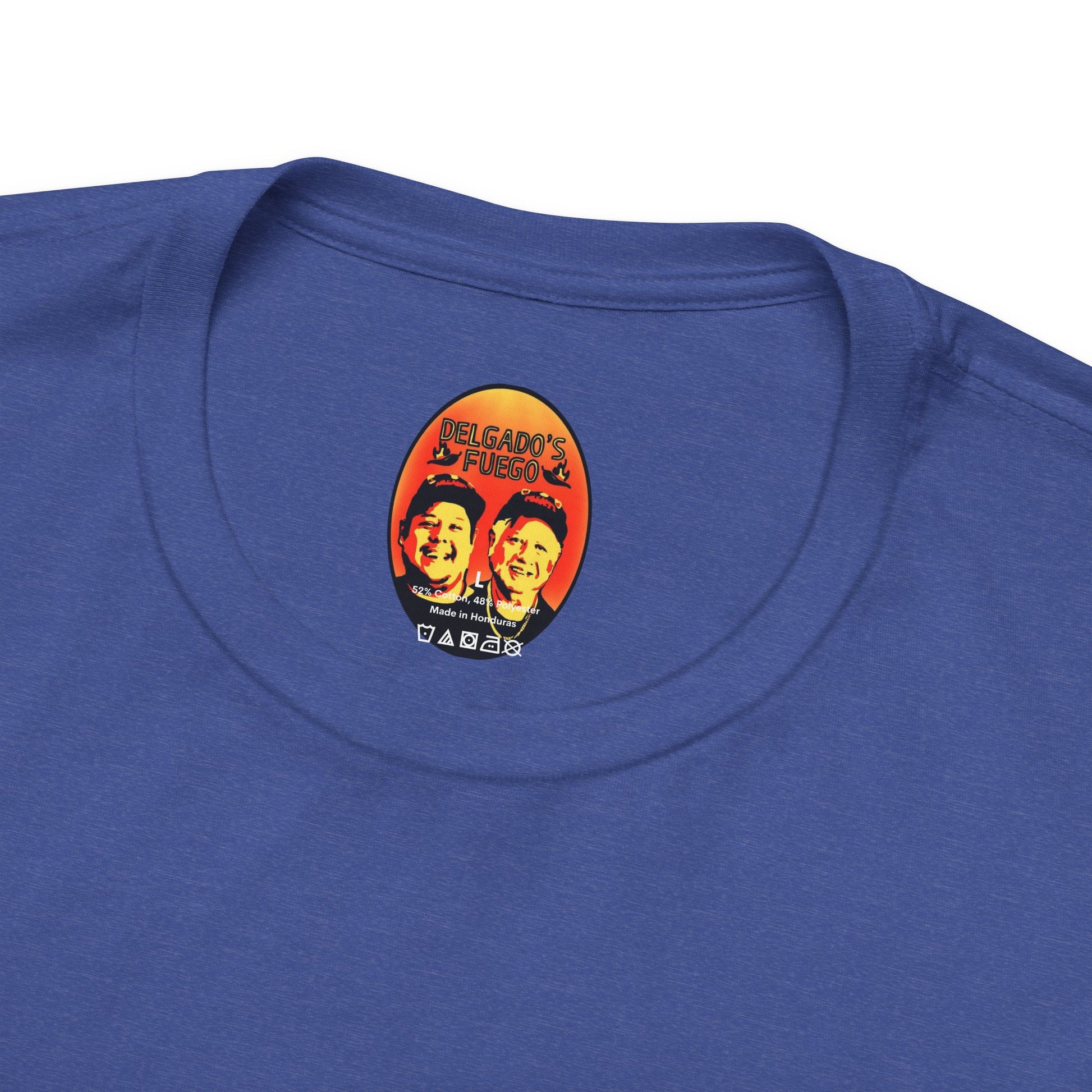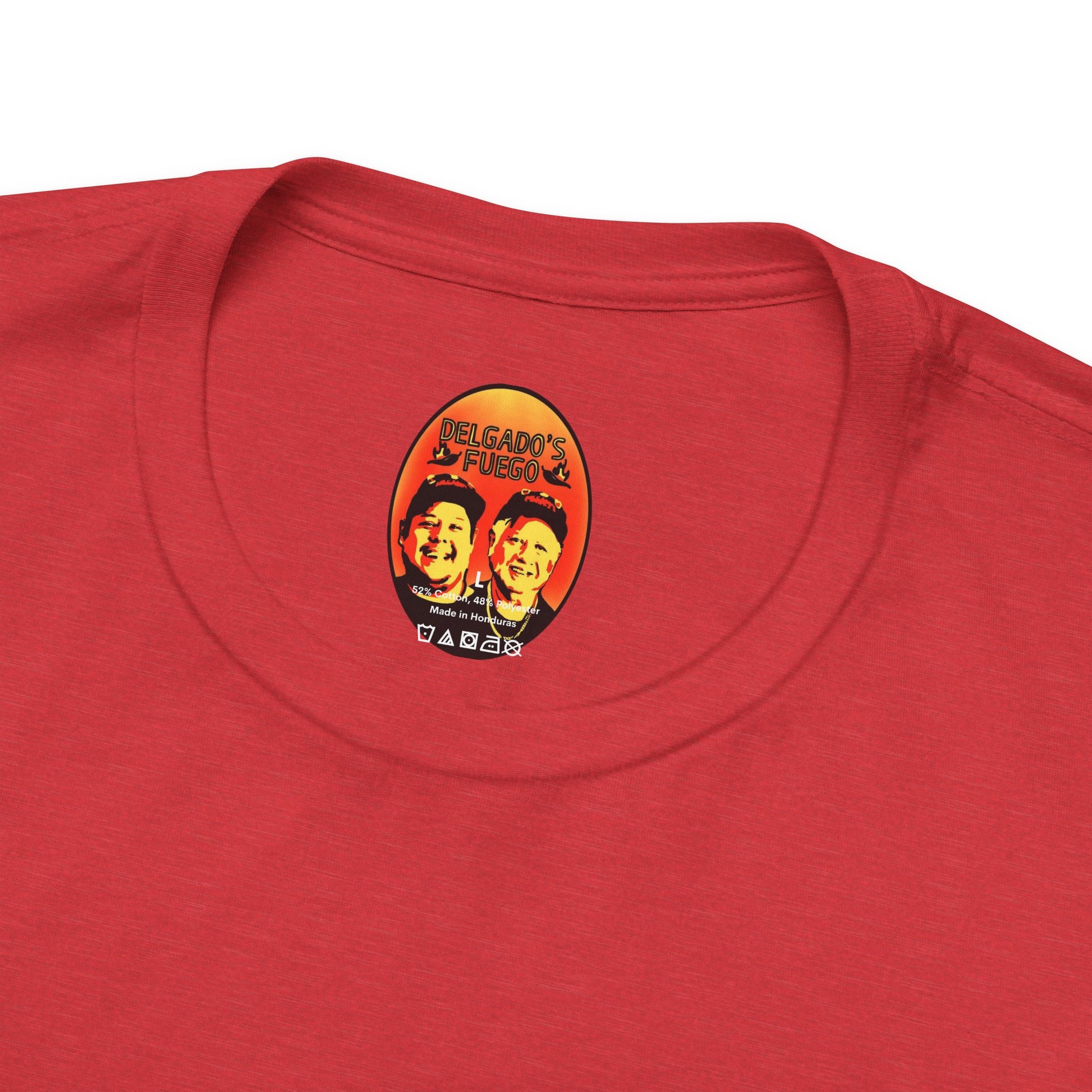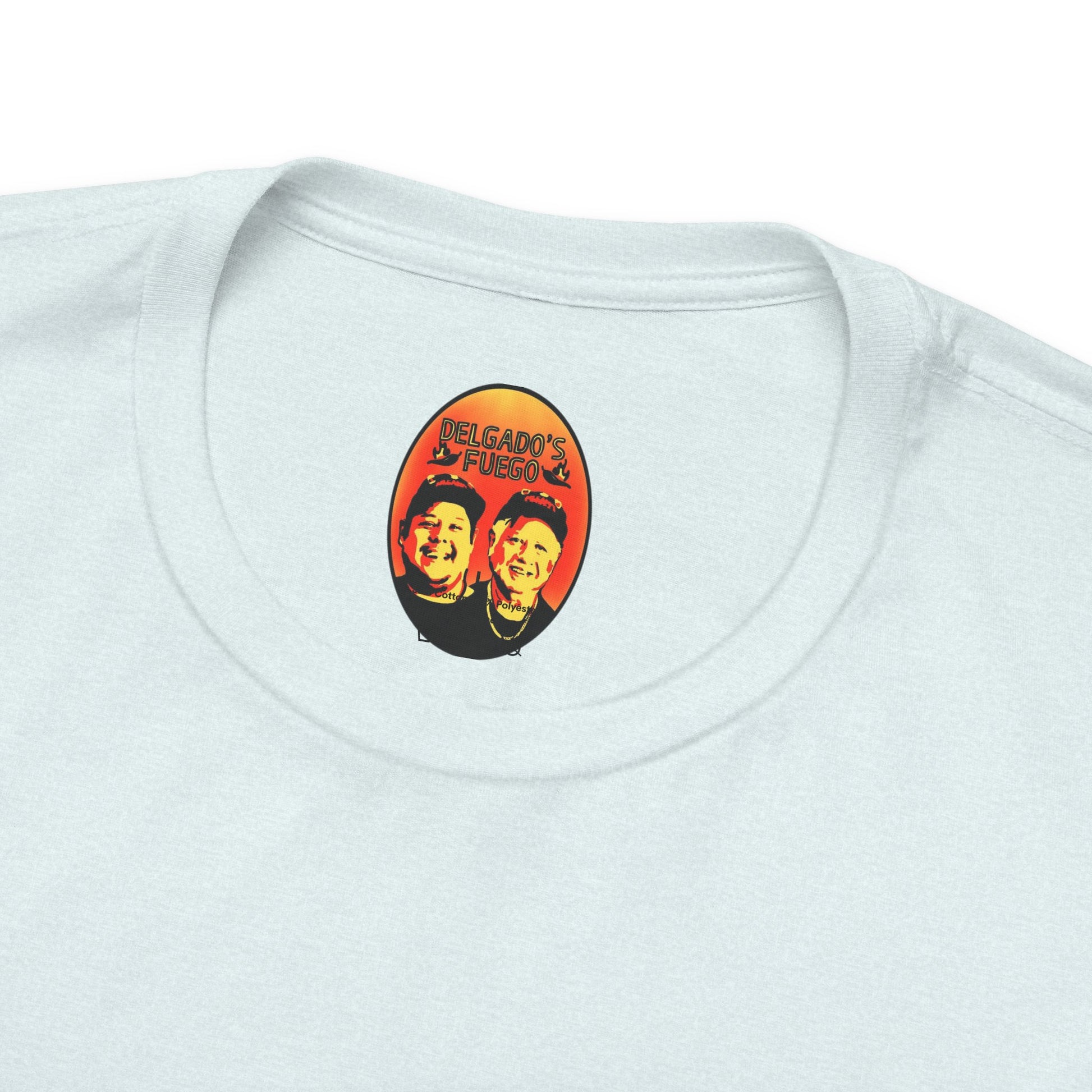 This lightweight jersey tee carries a sun-bleached, roadside-taco-stand energy. The front shows a worn, vintage-style badge reading “Delgado’s Fuego” with little flame illustrations—textured colors that pop against the white cotton. A small, smoky emblem sits on the upper back like a stamp of character. It feels lived-in from first wear: breathable, soft, and easy to layer under a jacket or over a morning coffee run. Wear it to street nights, market runs, taco crawls, or whenever you want a low-key piece that tells a story about good heat, late-night flavors, and hands-on craft.
