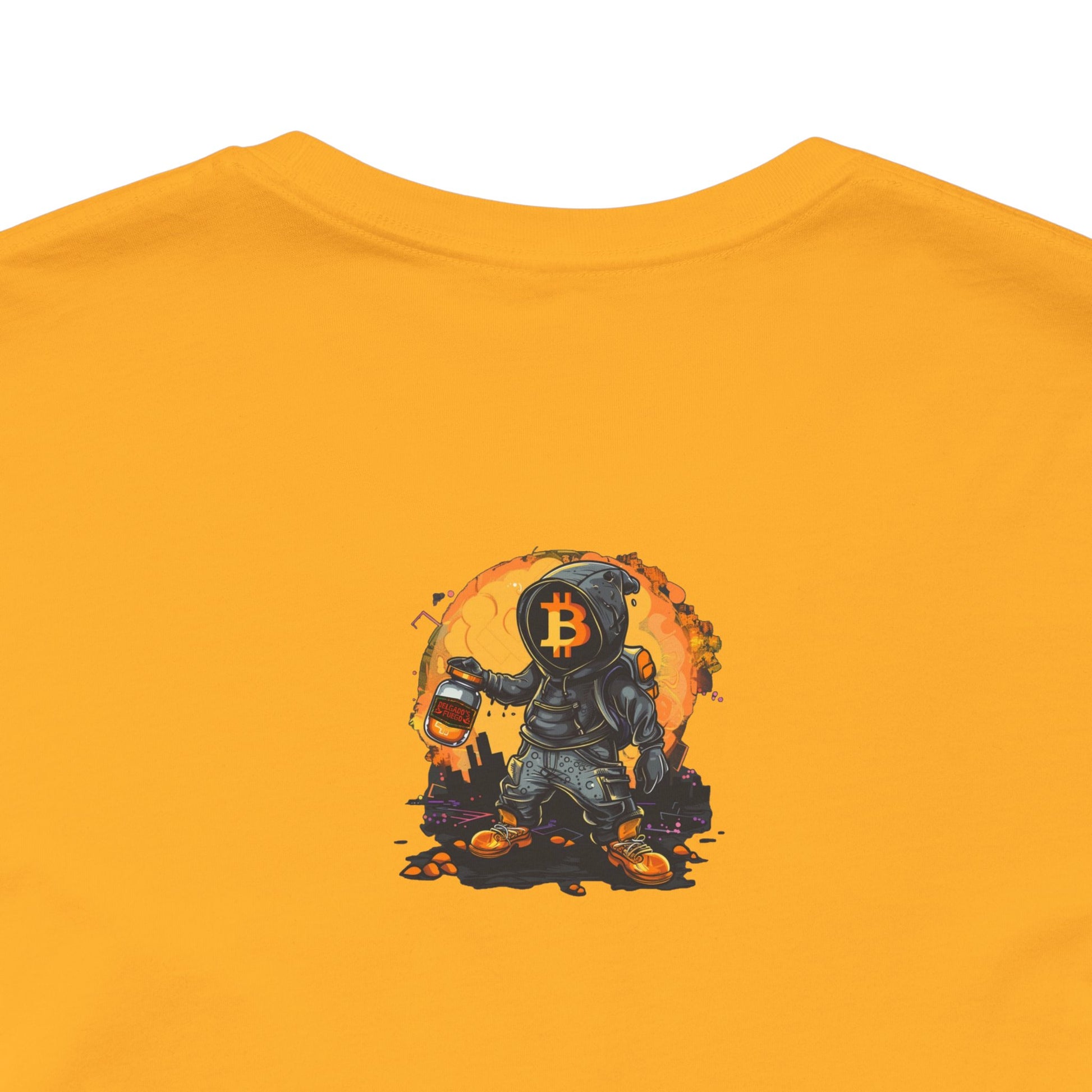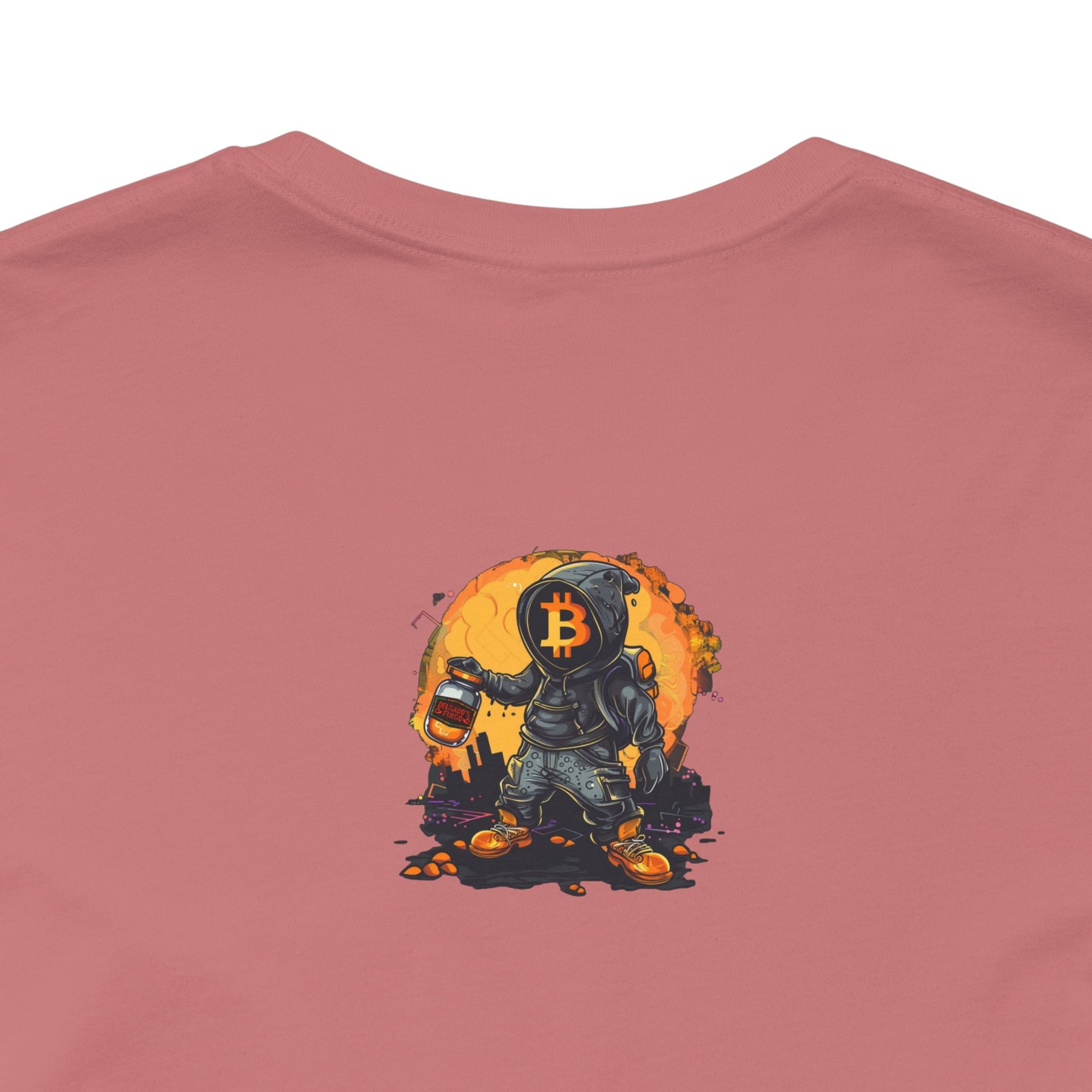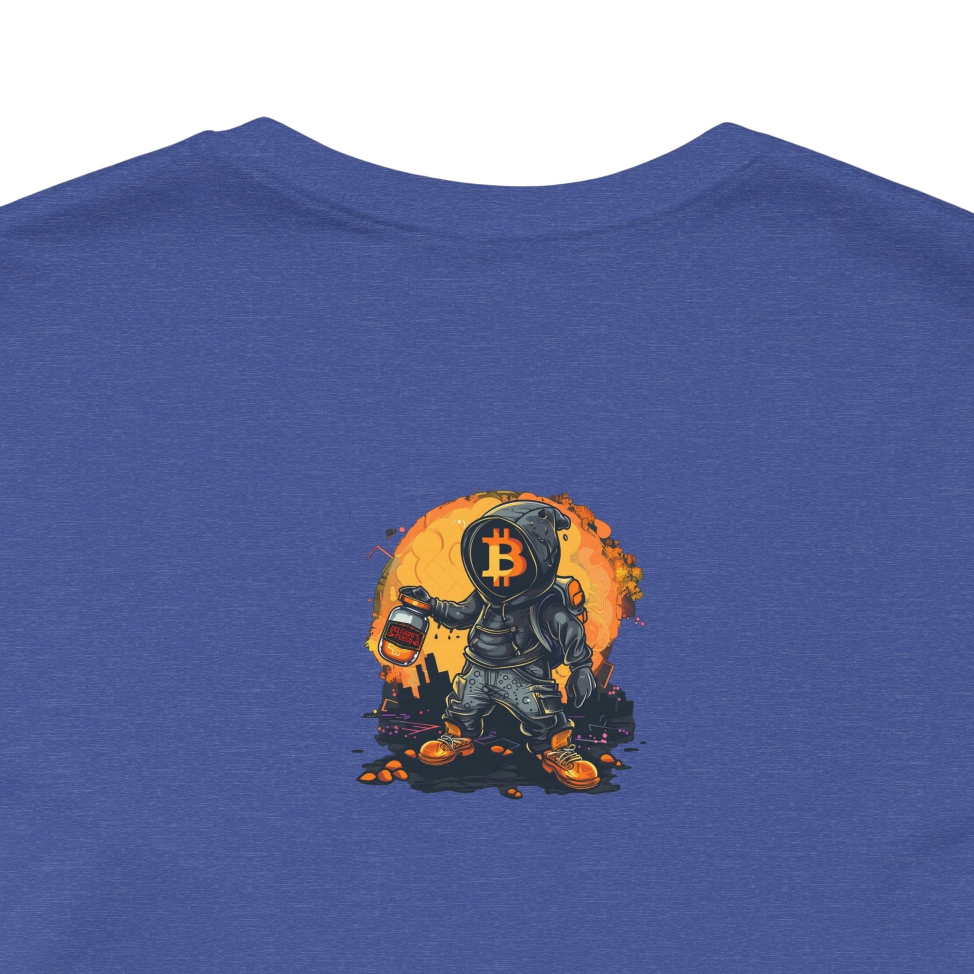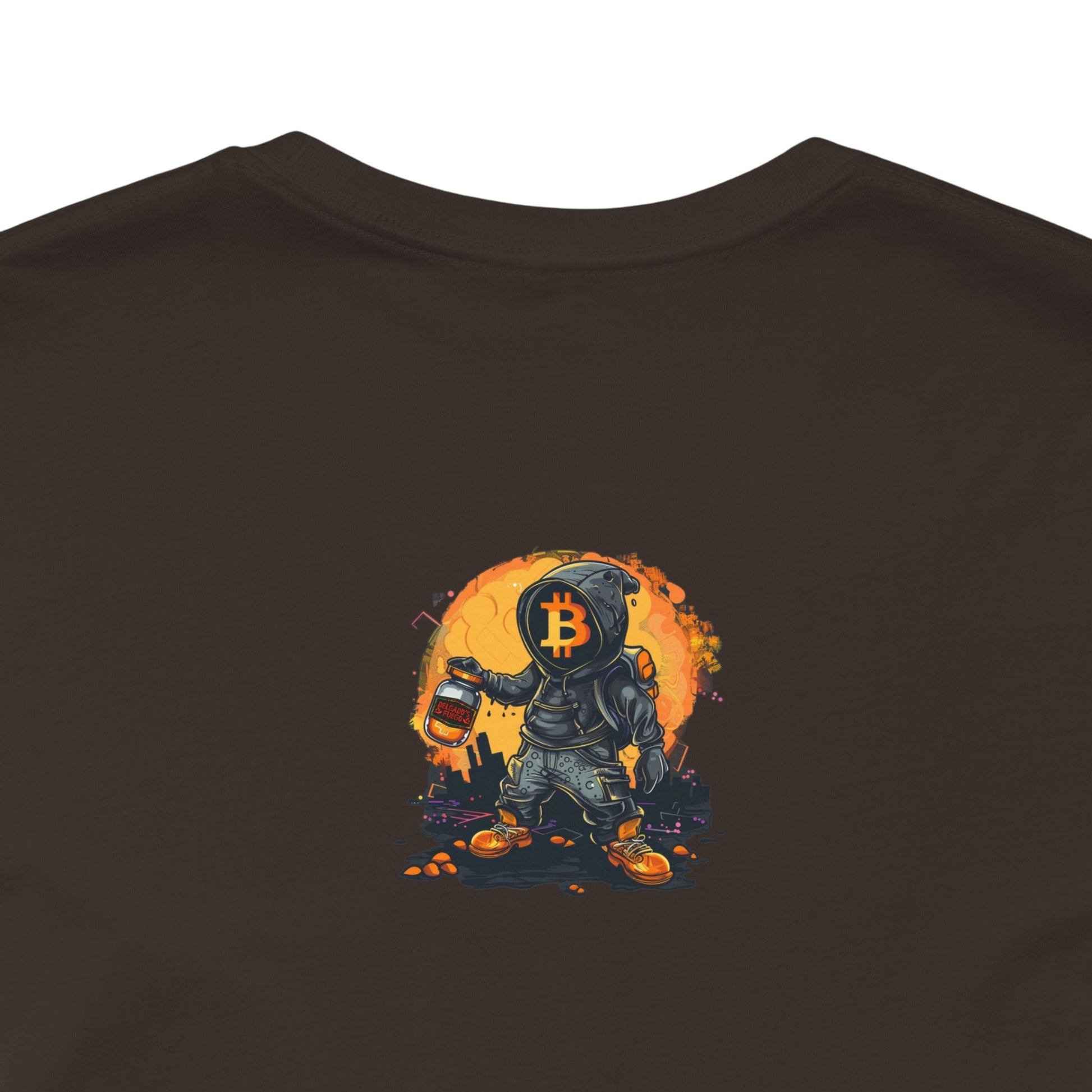 This lightweight jersey tee carries a sun-bleached, roadside-taco-stand energy. The front shows a worn, vintage-style badge reading “Delgado’s Fuego” with little flame illustrations—textured colors that pop against the white cotton. A small, smoky emblem sits on the upper back like a stamp of character. It feels lived-in from first wear: breathable, soft, and easy to layer under a jacket or over a morning coffee run. Wear it to street nights, market runs, taco crawls, or whenever you want a low-key piece that tells a story about good heat, late-night flavors, and hands-on craft.